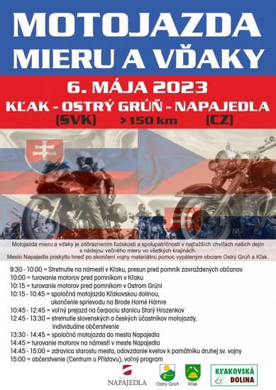 Motojazda mieru a vďaky 04/27/2023 - 0 Comments Pridal/a obec dňa 27 April 2023 6. mája 2023 Kľak - Ostrý Grúň - Napajedla Dokumenty motojazda-2023.pdf (668.61 KB) SÚVISIACE ČLÁNKY apr 27, 2026 Motojazda mieru a vďaky 2026 apr 01, 2026 K Veľkej Noci mar 07, 2026 K Medzinárodnému Dňu Žien feb 12, 2026 13. ročník Kľakovskej obecnej zabíjačky jan 06, 2026 Pietne spomienkové zhromaždenie okt 17, 2025 KAČACIE HODY A HODOVÁ ZÁBAVA 2025