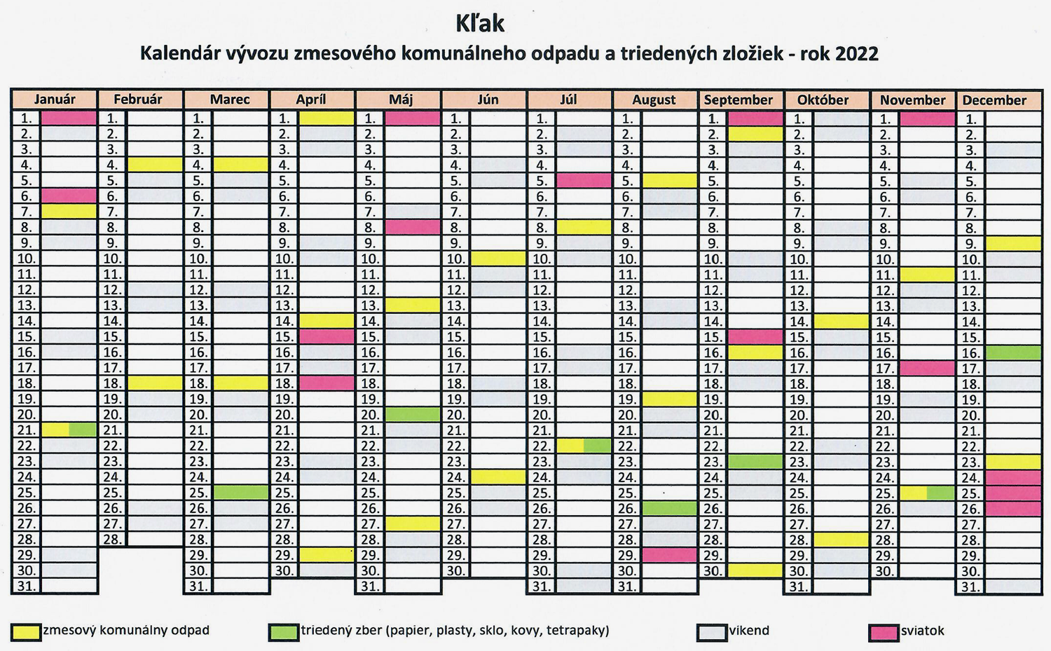 Kalendár vývozu odpadu na rok 2022 01/07/2022 - 0 Comments Pridal/a obec dňa 7 January 2022 Kalendár vývozu odpadu na rok 2022 na stiahnutie nájdete aj v časti: Dokument na stiahnutie (PDF) > SÚVISIACE ČLÁNKY apr 28, 2026 STAVANIE MÁJA apr 28, 2026 Referendum 2026 apr 27, 2026 Motojazda mieru a vďaky 2026 apr 01, 2026 K Veľkej Noci mar 07, 2026 K Medzinárodnému Dňu Žien mar 02, 2026 Zasadnutie Obecného zastupiteľstva obce Kľak